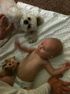 My biggest concern I asked the pedi about is his head. From the beginning Carter's head has been slightly flatter on the right side than left. We've tried a few things to help with this, but we were still concerned about it. The dr wants to wait until 6 months to see what changes, and then we'll determine if we need to visit a neurosurgeon (not for surgery, but most likely for a helmet). In the meantime we will be spending even more time putting Carter in the Bumbo and on his tummy to see if that will help. Not that a helmet will be the end of the world, but we'd love to avoid that if possible.